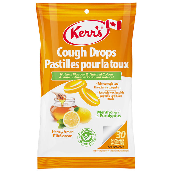 Kerr's Honey Lemon Menthol Eucalyptus Cough Drops provide temporary relief of sore throat, nasal congestion and cough.