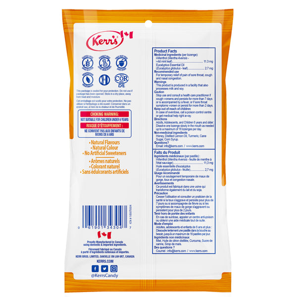 Kerr's Honey Lemon Menthol Eucalyptus Cough Drops provide temporary relief of sore throat, nasal congestion and cough.